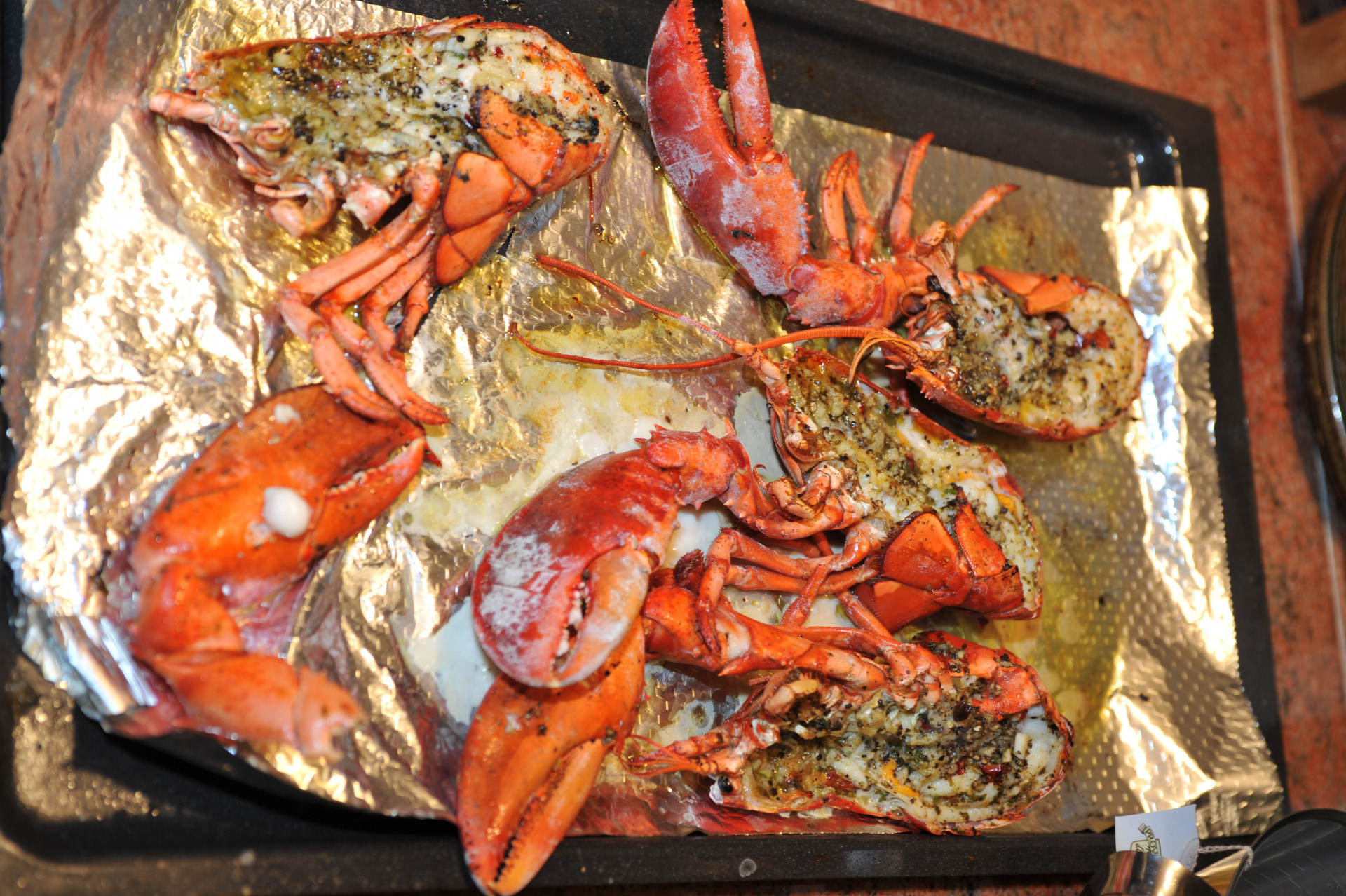 Zubereitung: Lobster unter fließendem kalten Wasser auftauen und in kochendem Salzwasser 12-15 Minuten garen. Anschließend in kaltem Wasser abkühlen. Dann den Lobster längst in zwei Hälften teilen, mit Kräutern und Olivenöl bestreichen und mit Oberhitze im Backofen zuende garen.
