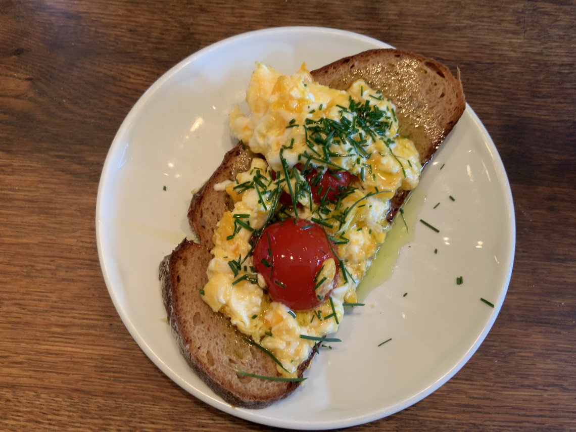 Herzgesunder Snack: #435 Rührei auf Bauernbrot mit Olivenöl und Tomate