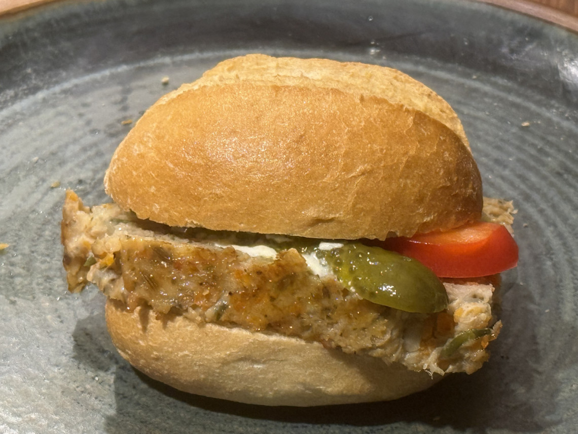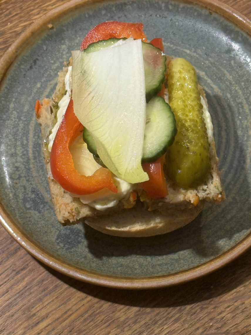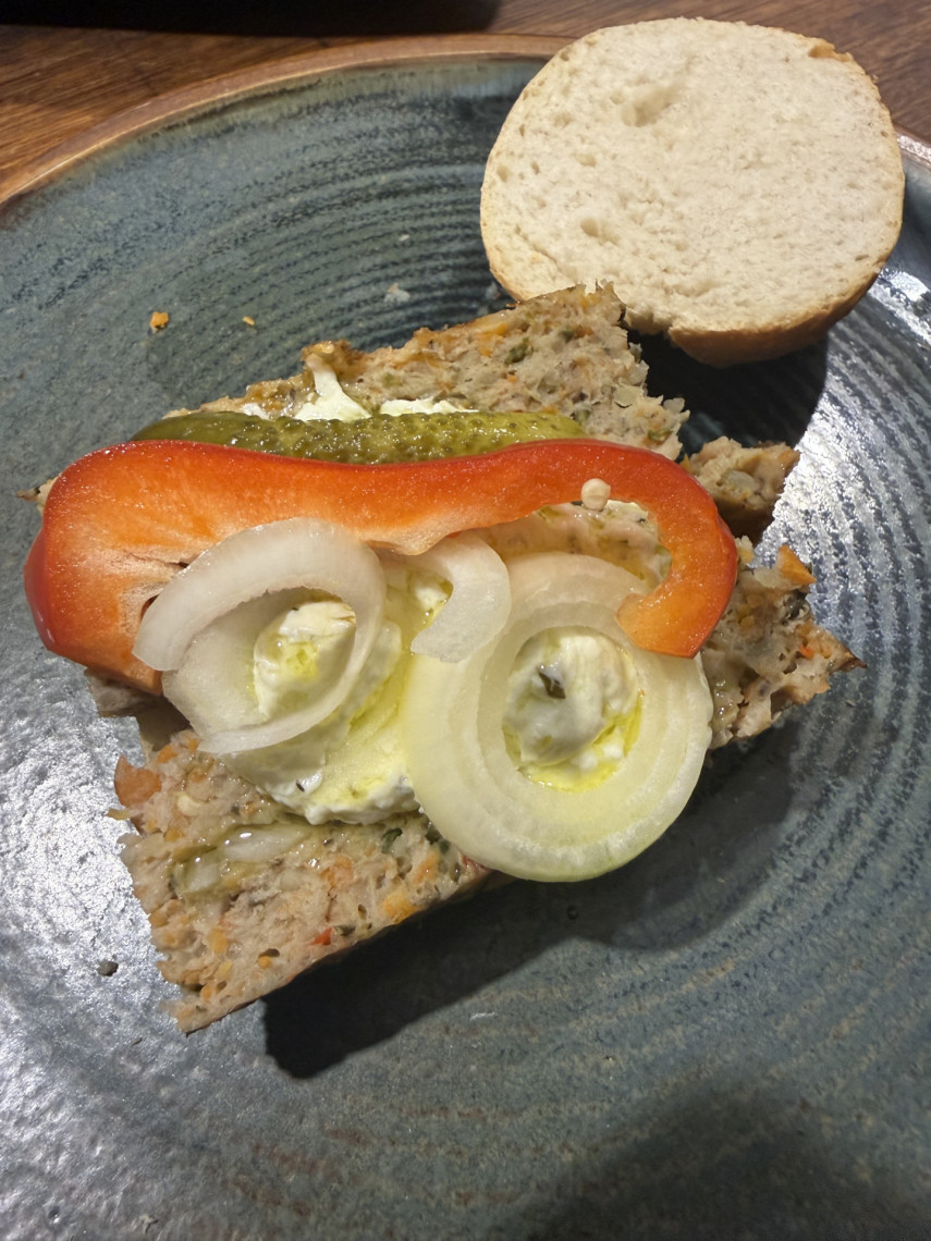 Zubereitung: Seelachsterrine aus Rp. #592, rote Paprika in Streifen, Zwiebelscheiben, Chicorée, sauer eingelegte Gurken, Salatgurke in Scheiben, Dressing aus griechischem Joghurt, Olivenöl, Zitronensaft, Kräuter der Provence und Meersalz, TK-Brötchen.