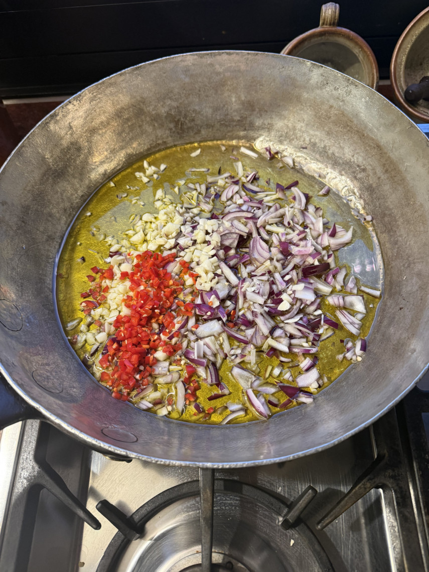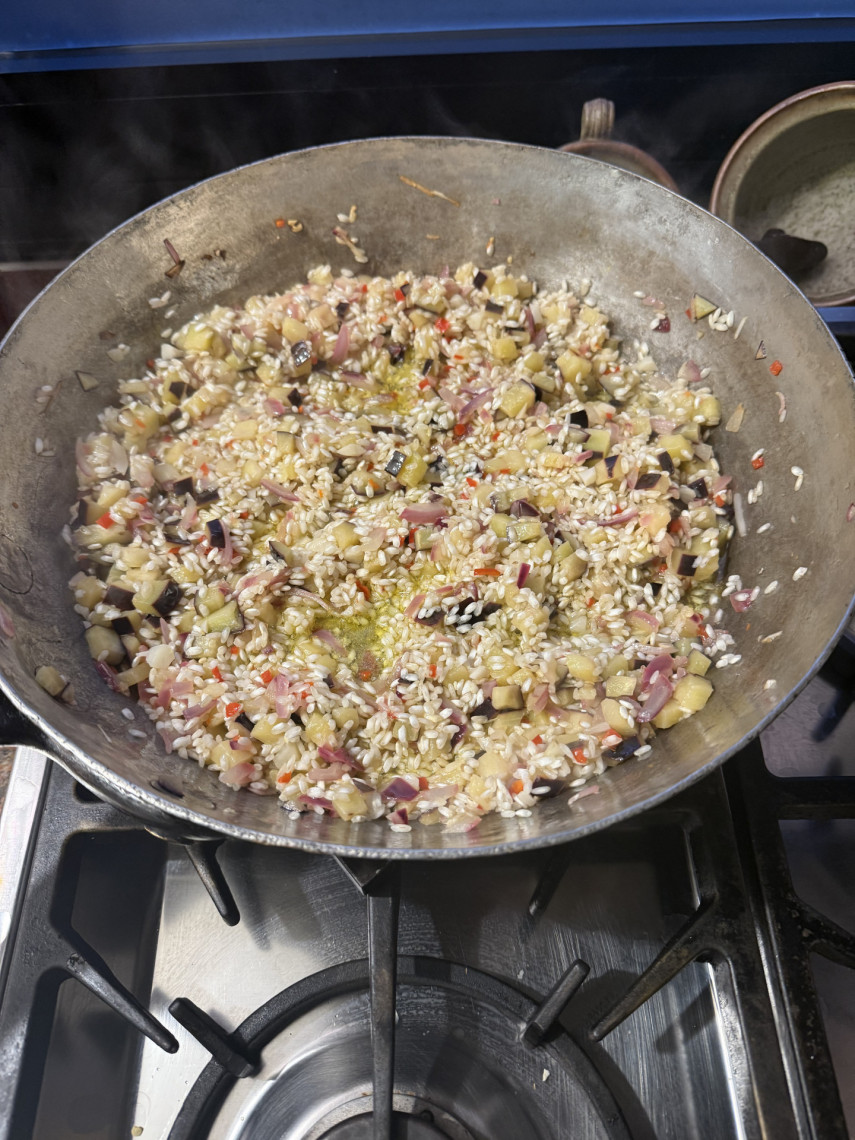 Zutaten für 7-8 Personen: 500 gr. Lachsfilet, 400 gr. Bomba-Reis, 2,0 Liter Gemüsefond, eine Auberginen, zwei rote Zwiebeln, eine gelbe Paprika, 1 Knoblauchknolle, 100 ml Olivenöl, grobes Meersalz, 250 gr. Kirschtomaten, 800 gr. San Marzano Dosentomaten, 250 gr. TK-Erbsen, 3 EL Aceto balsamico, 1 EL klein gehackte Kapern, 1/2 TL Muskatblüte (Macis), 1/4 Liter Süßwein, grobes Meersalz.